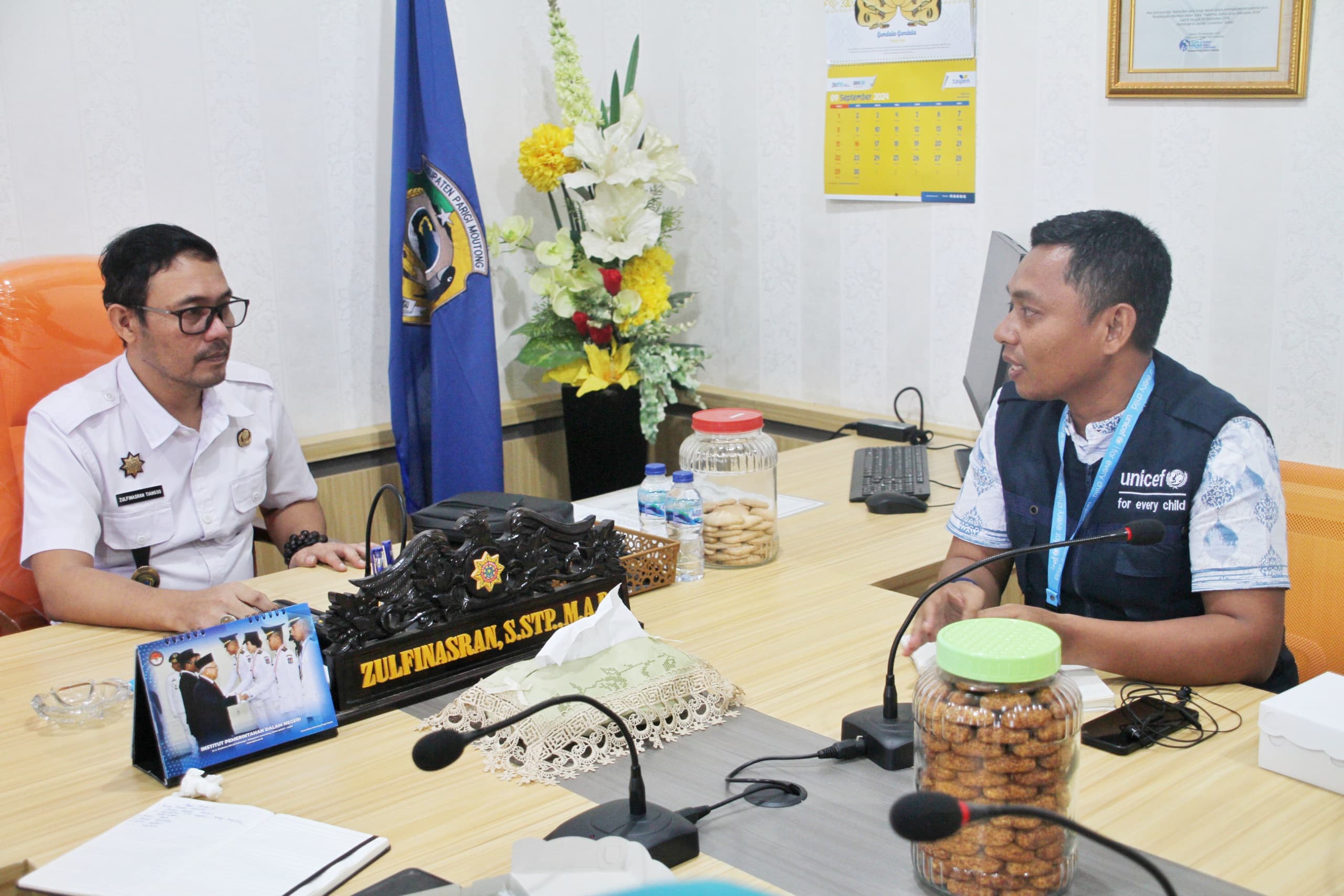 Konsultan imunisasi perwakilan UNICEF, Hermansyah melakukan Audiensi dengan Pemerintah Daerah (Pemda) Kabupaten Parigi Moutong yang diwakili oleh Sekretaris Daerah (Sekda), Zulfinasran, di ruang kerja Sekda, Rabu, 11 September 2024.