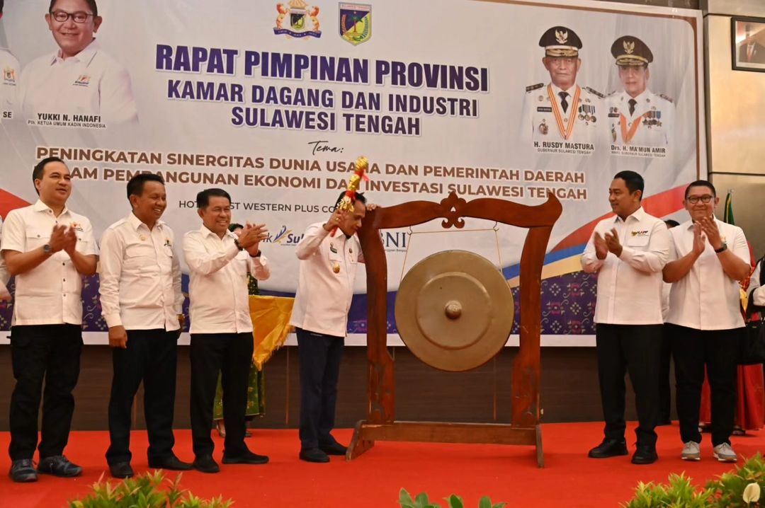 Pembukaan Rapim yang mengangkat tema ‘Peningkatan Sinergitas Dunia Usaha dan Pemerintah Daerah Dalam Pembangunan Ekonomi dan Investasi Sulawesi Tengah’, ditandai pemukulan gong oleh Wagub Mamun Amir didampingi Kepala Lembaga Kebijakan Pengadaan Barang dan Jasa Pemerintah (LKPP) RI, Hendrar Prihadi. Ketua Umum Kadin Pusat, Yukki Nugrahawan Hanafi, Ketua Kadin Sulteng Nur Dg Rahmatu.