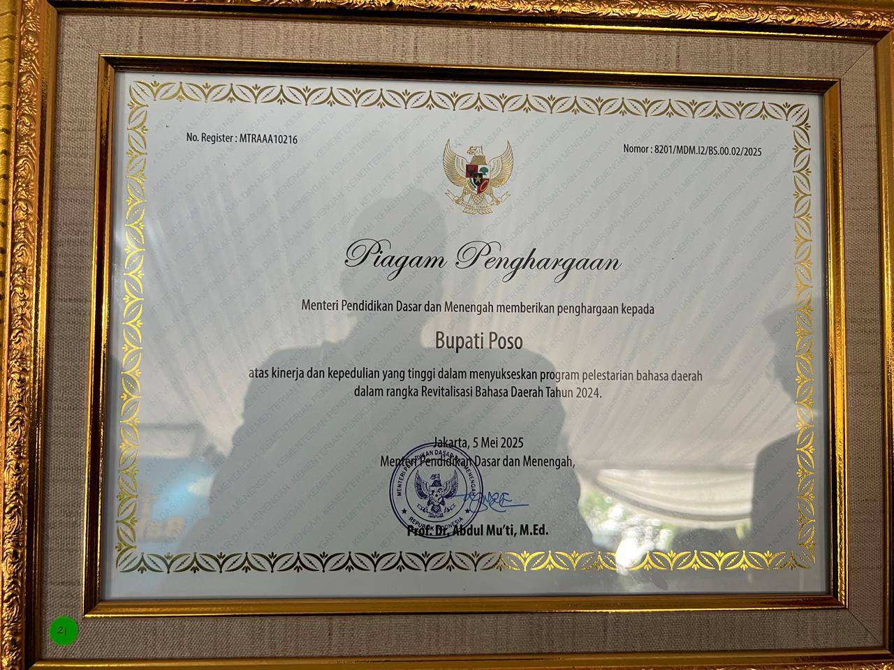 Penghargaan tersebut diberikan kepada 10 kepala daerah di Indonesia, termasuk Bupati Verna, yang dinilai aktif mendukung pelestarian bahasa ibu di wilayah masing-masing. Pemerintah Kabupaten Poso dinilai konsisten mendorong penggunaan dan pembelajaran bahasa daerah dalam dunia pendidikan serta memperkuat program pelestarian budaya lokal.