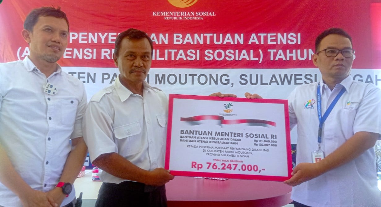 KEMENTERIAN Sosial (Kemensos) RI melalui Centra Nipotowe Palu menyerahkan bantuan Asistensi Rehabilitasi Sosial (ATENSI) tahun 2023 kepada 39 orang penyandang disabilitas Parigi Moutong  di Aula Mako Tagana Dinas Sosial kabupaten Parigi Moutong, Rabu 15 Maret 2023.