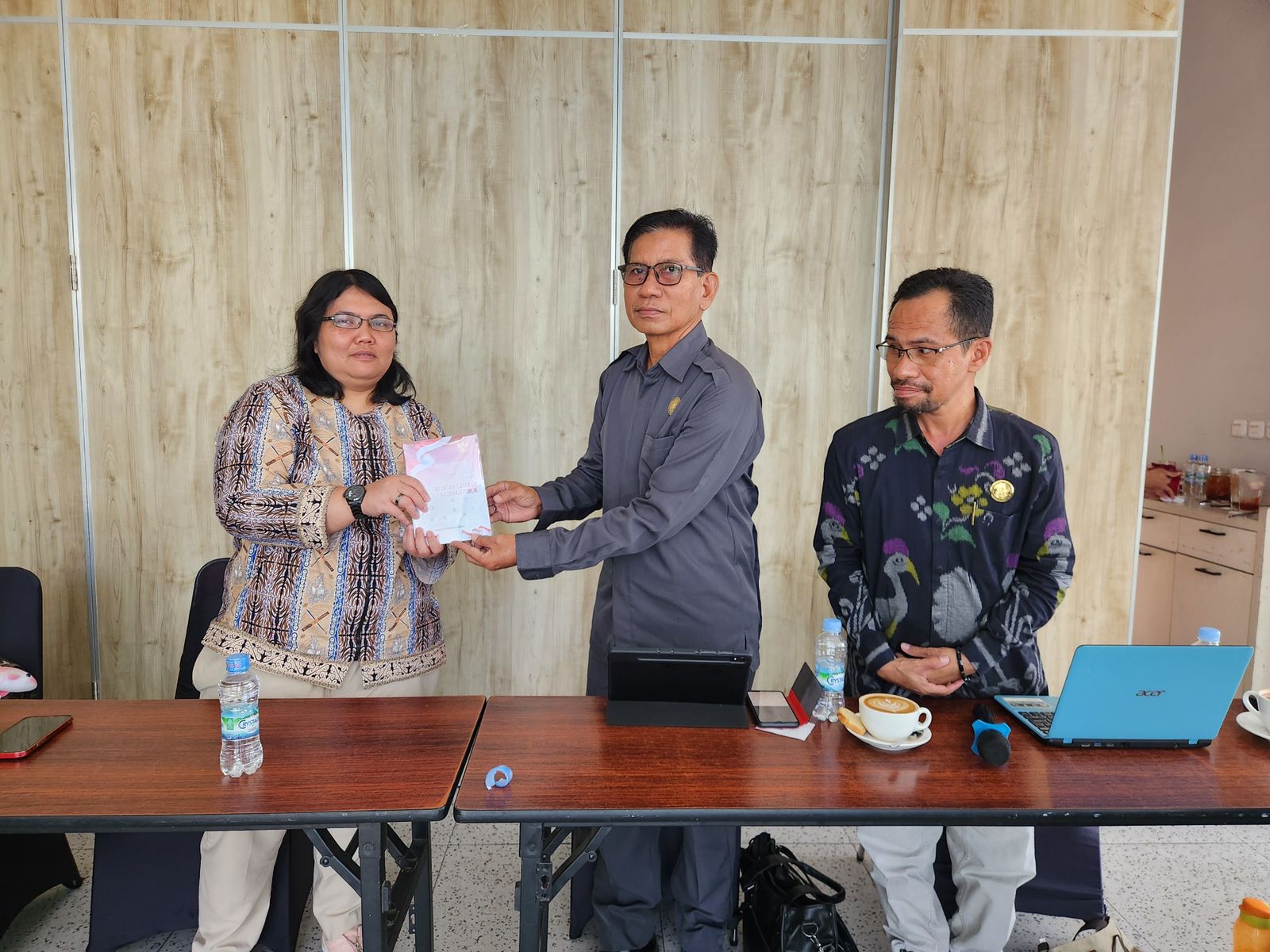 Ketua KI Sulteng, H. Abbas, H.A Rahim menyerahkan sebuah buku yang berisi Peraturan Komisi Informasi Republik Indonesia Nomor 1 tahun 2021 tentang Standar Layanan Informasi Publik, diterima oleh Kepala BPJS Kesehatan Cabang Palu, HS Rumondang Pakpahan.